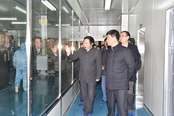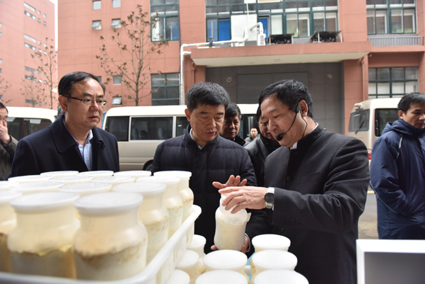六安市市委書(shū)記孫云飛和市長(zhǎng)畢小彬(左)觀看錦華食用菌的菌瓶