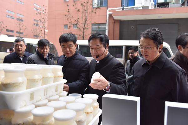 視察全自動包裝車間,六安市委副書記.金寨縣委書記潘東旭(中)陪同,詳細了解食用菌產(chǎn)品
