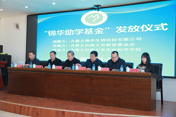 2018年11月28日上午9時,在內(nèi)蒙古民族大學西拉木倫校區(qū)新蒙醫(yī)藥樓912室舉行“錦華助學基金”發(fā)放儀式。內(nèi)蒙古民族大學校黨委委員、副校長李文閣,內(nèi)蒙古民族大學教育基金會理事長朝倫巴特爾,內(nèi)蒙古錦華生物科技有限公司總經(jīng)理蘇振泉,內(nèi)蒙古民族大學教育基金會副秘書長賀智慧,內(nèi)蒙古錦華生物科技有限公司金寨生產(chǎn)基地副總經(jīng)理房美春以及受資助學生參加發(fā)放儀式。
