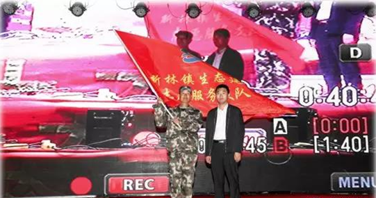 趙慧武鎮(zhèn)長向“蘇人牧場”授旗(“新林鎮(zhèn)生態(tài)建設(shè)志愿服務大隊”)
